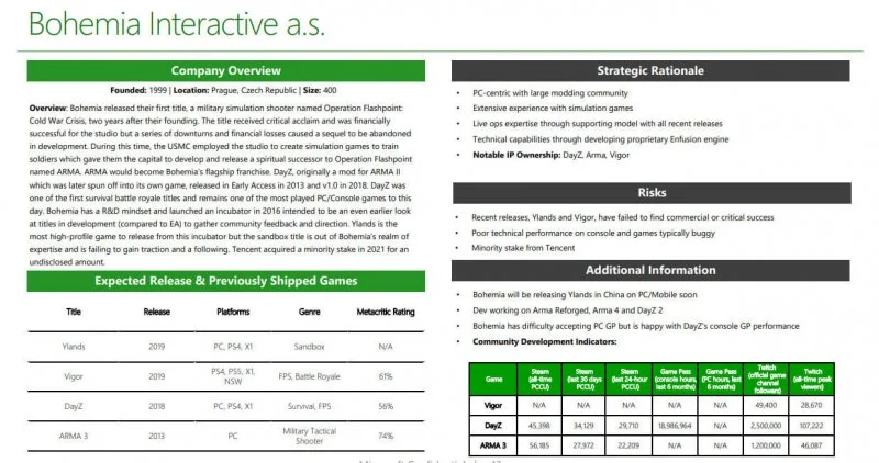 En este caso concreto, un documento en el que se resume la historia de Bohemia Interactive, sus características, sus puntos fuertes y sus inconvenientes en caso de una posible compra. En el apartado «Información adicional», se indica que los desarrolladores del estudio están trabajando en Arma Reforged, Arma 4 y, por supuesto, DayZ 2.